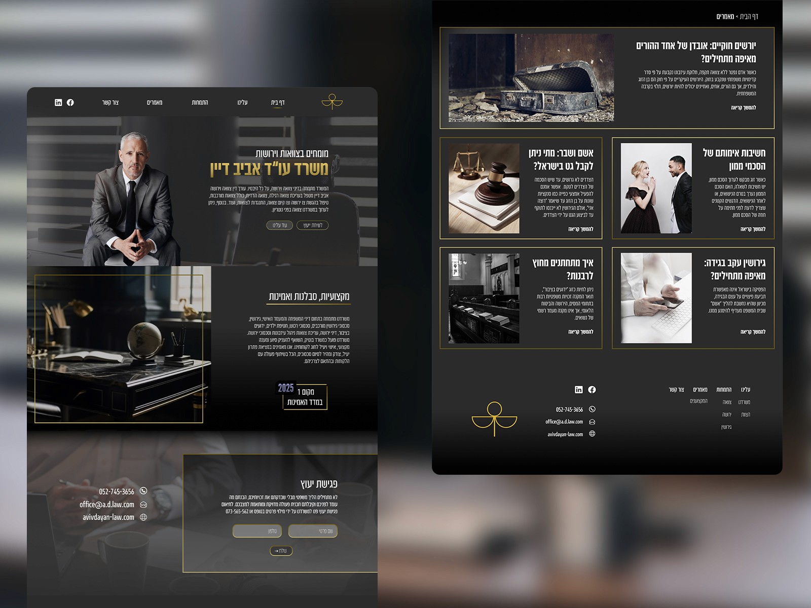 אחד הדברים החשובים בתהליך היה לחבר בין היוקרה והאלגנטיות של המותג לבין תחושת הסמכות והאמון שמשרד עורכי דין צריך לשדר. אספנו השראות מודרניות, איזון וצדק תוך התבוננות בצורות גיאומטריות מדויקות, מאזניים, קווים סימטריים ואלמנטים מעולם המשפט. בחרנו בגופן סריפי שמרגיש קלאסי ורציני אך גם נקי ומודרני, כדי לשדר מקצועיות, יציבות וביטחון. הצבעים שנבחרו הם זהב על רקע שחור ובכך נותנים תחושת יוקרה, יושרה, ואמינות.